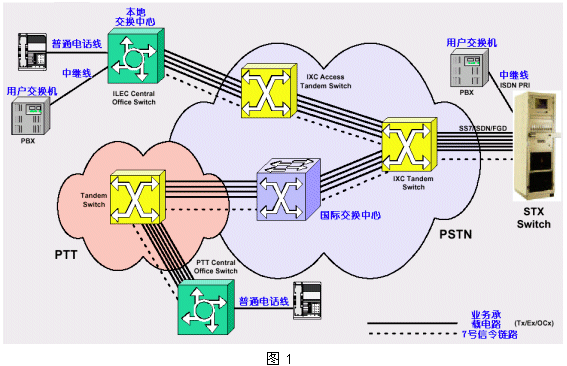 圖1給出了傳統(tǒng)電話網絡PSTN的組織結構圖。它是目前規(guī)模最大的電話業(yè)務網絡,通過標準的信令控制網絡(SS7),成為覆蓋全球的大型電話網絡。這個網絡和Internet互聯(lián)網有著驚人的相似,它們都采用級聯(lián)結構,具有易于擴展的特性。