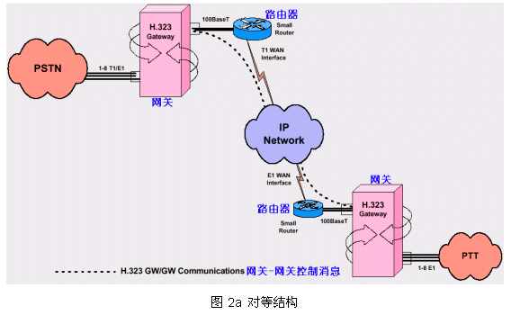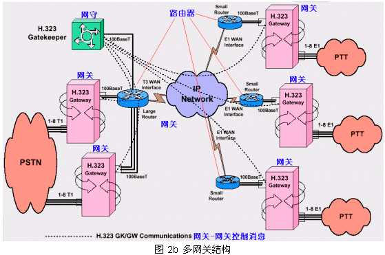 圖2a給出了一個對等網關下的組織結構和消息流結構;圖2b則給出了一個多網關結構和相應的消息流程,其中的網守可以集中控制各個網關。