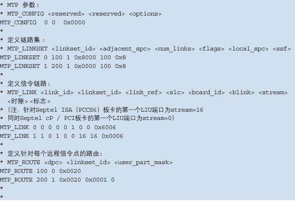 system.txt文件必須也包括主機(jī)上運行的所有本地SS7協(xié)議,如ISUP、TUP、SCCP或TCAP(如果有),以及應(yīng)用程序任務(wù)、配置工具(如s7_mgt)和調(diào)試工具的LOCAL定義。這里也應(yīng)該通過FORK_PROCESS語句來啟動相應(yīng)的驅(qū)動和支持任務(wù),在相應(yīng)的程序員手冊中有詳細(xì)描述。