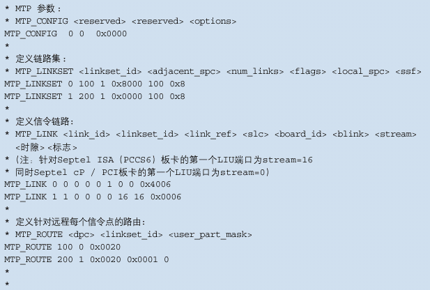 每一目標(biāo)路由(包括相鄰節(jié)點)都應(yīng)該指明兩個鏈路集。主要的是連接本地MTP到相鄰節(jié)點的鏈路集的標(biāo)識符。參數(shù)應(yīng)該用來表示連接共享一個本地點代碼的兩個MTP3層的鏈路集。參數(shù)應(yīng)該設(shè)為0x0001,表明第二個鏈路集已經(jīng)被指定,并且只有在通過主要鏈路集無法路由到目標(biāo)節(jié)點的情況下,才可使用這個鏈路集來路由傳輸流量。所有其它參數(shù)的含義都與用戶手冊中描述的單MTP設(shè)置中的參數(shù)相同。