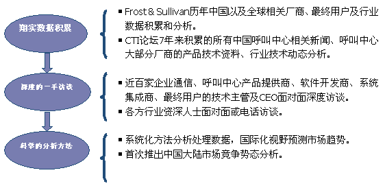 Frost & Sullivan 和 CTI論壇(www.skybaby168.com)共同組成的調(diào)研小組,在查閱了大量資料的基礎(chǔ)之上,以企業(yè)通信及呼叫中心的設(shè)備應(yīng)用、投資計(jì)劃以及相關(guān)廠商的市場表現(xiàn)為出發(fā)點(diǎn),通過對企業(yè)通信及呼叫中心重要應(yīng)用企業(yè)、在市場占主導(dǎo)地位的二十多家設(shè)備廠商、二十多家軟件開發(fā)商、十幾家系統(tǒng)集成商、數(shù)家外包運(yùn)營商的深度訪談,參閱內(nèi)部相關(guān)報(bào)告及數(shù)據(jù)庫,對數(shù)據(jù)的來源和數(shù)據(jù)的準(zhǔn)確性進(jìn)行了詳細(xì)核對與論證;憑借參與調(diào)研人員的多年從業(yè)經(jīng)